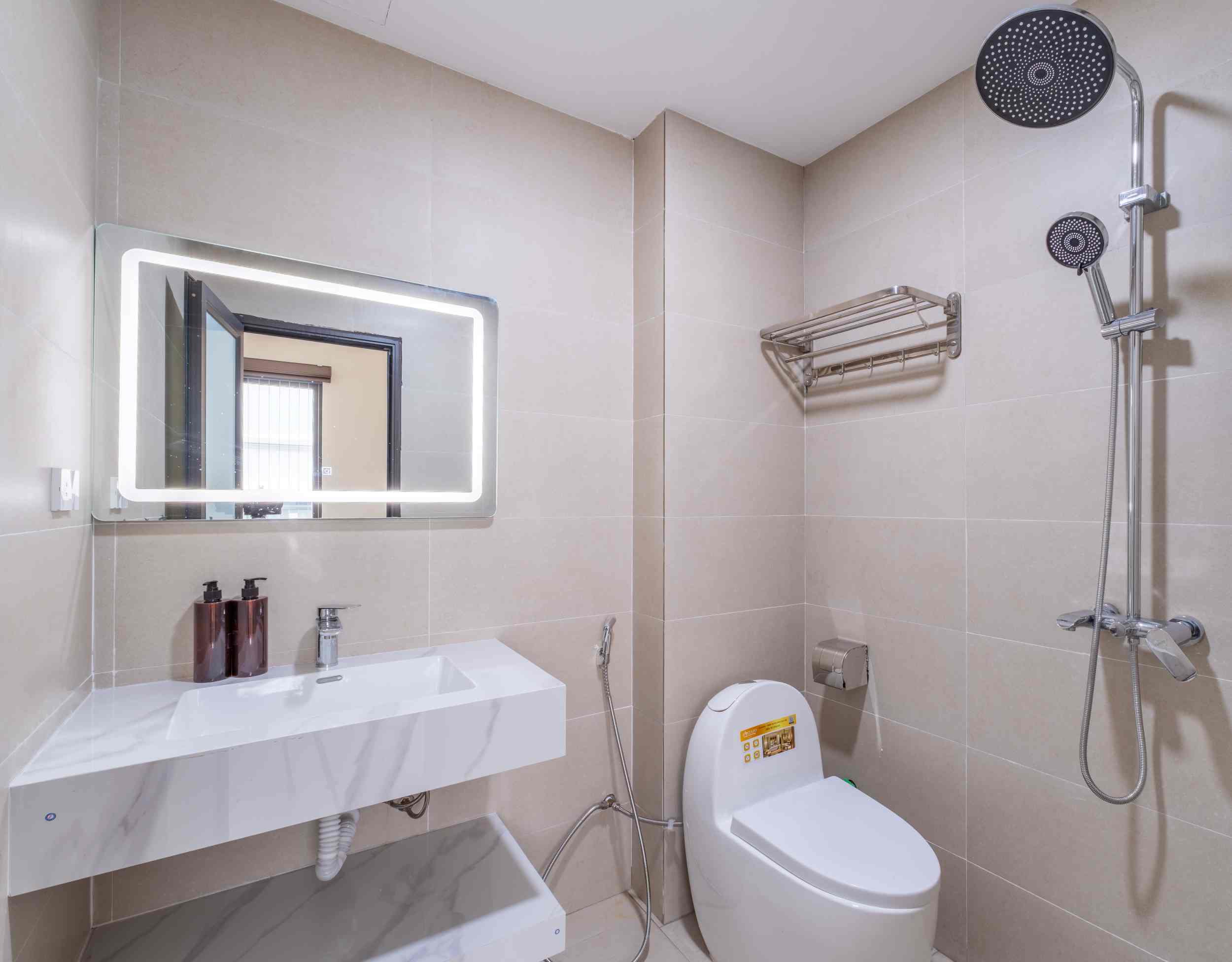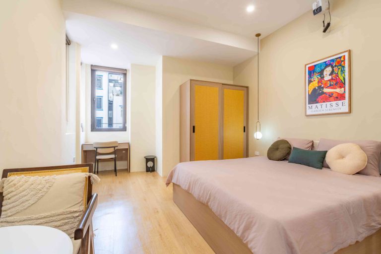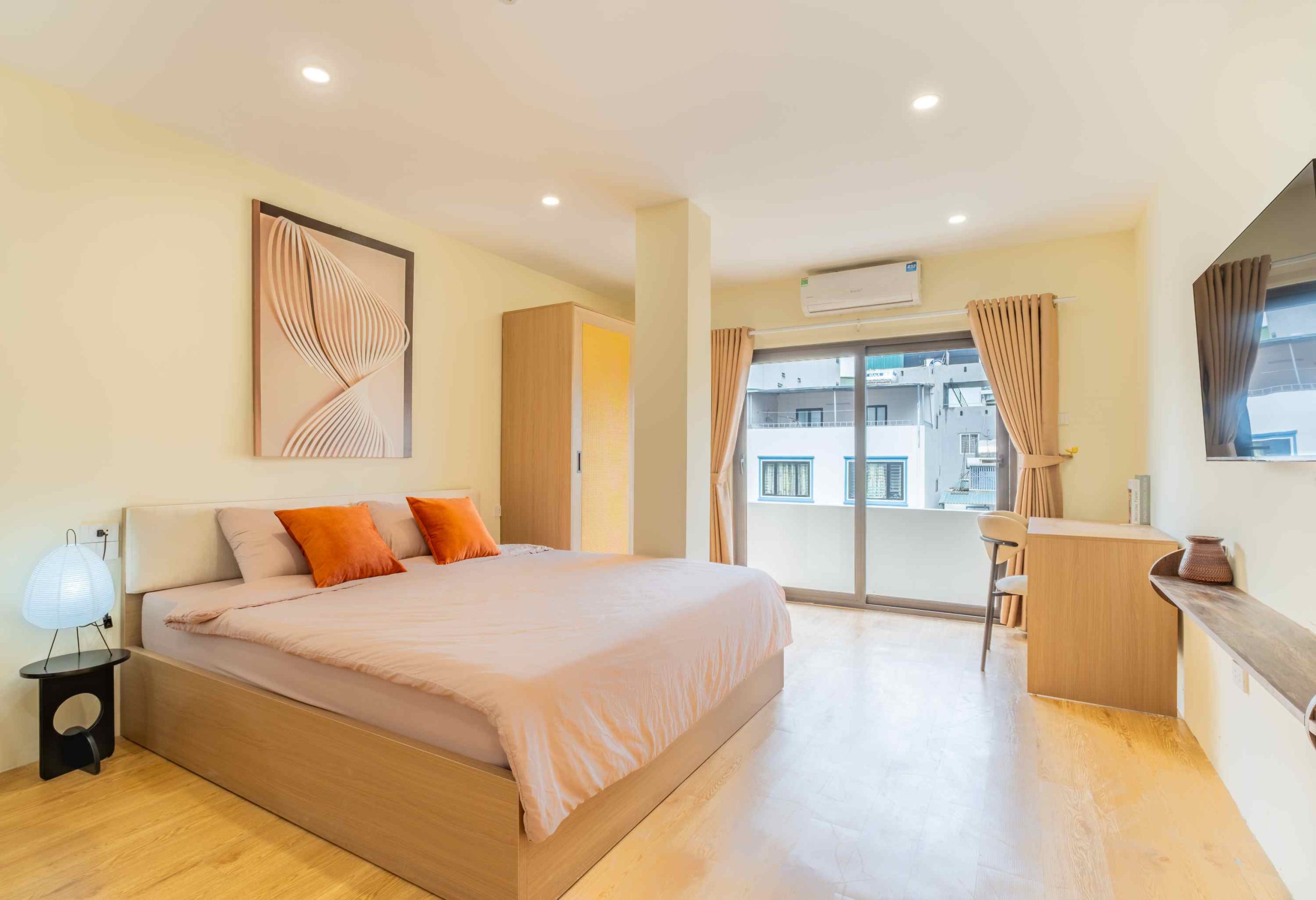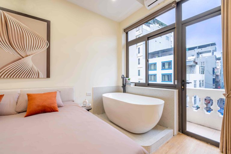 Mỗi phòng đều đón ánh sáng tự nhiên qua cửa sổ hoặc ban công thoáng đãng, tạo nên một không gian luôn sáng sủa và dễ chịu. Nội thất được chuẩn bị đầy đủ: bếp, phòng tắm riêng (có bồn tắm), TV/máy chiếu phục vụ giải trí, cùng thang máy tiện lợi cho việc di chuyển trong tòa nhà.